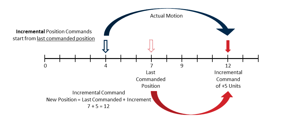 | For an Incremental move, the starting point is the last commanded position. Even though the actual rotor is at position 4; an Incremental move command of 5 units will result in the rotor moving to position 12 (7 + 5 = 12) | ![]() |