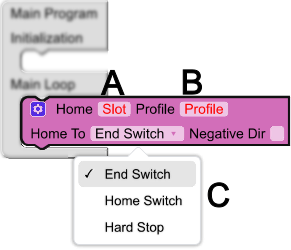 | C | From the drop down, select the desired Home position method: Home Switch End Switch Hard Stop |