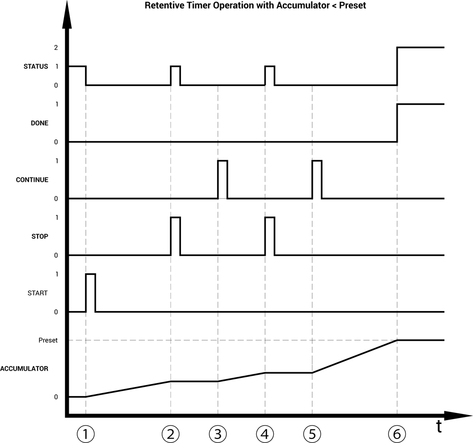 A Retentive timer is one that when the elapsed time is less than the Preset value, a leading edge Stop command stops the timer and hold the accumulated elapsed time value. In this state, a leading edge Continue command causes the timer to restart and continue accumulating elapsed time without any reset to 0. This Stop and Continue sequence can continue as long as the elapsed time is less than the Preset time.