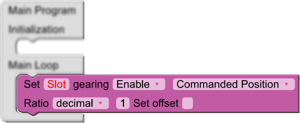 | The Electronic Gearing block is designed for applications requiring precise coordination between a Master Motor and a Follower Motor. Users can seamlessly configure and control the relationship of these motors by establishing a virtual coupling mechanism between axes. Using values from the Master Motor, the Follower Motor can move in tandem with the Master. The Master:Follower Ratio describes the distance that one motor moves compared to the distance that the other motor moves. A ratio of 1:1 with no offset would denote an identical movement for each motor, both going the same distance and direction – “Distance of Master”:“Distance of Follower”. A ratio of 1:2 with no offset means when that the Master Motor makes one full rotation, the Follower Motor makes two full rotations. Utilizing negative numbers will change the direction of the rotation. A ratio of 1:-1 means that if the Master Motor moves in a positive direction, the Follower moves in the negative direction and vice versa. The offset can be thought of as the position of the Follower when the Master is at position zero. |