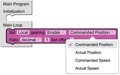| Actual Position | Maintains the motors’ relationship to each other dynamically, based on the configured ratio and offset parameters. Less commonly chosen as it requires the Follower Motor to exactly follow the Master Motor’s course and calculate its movements based on the Master Motor’s real-time movements which can accumulate error |